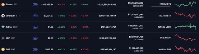 21일 글로벌 가상자산 시황중계 사이트 코인마켓캡에 따르면 이날 오전 6시 30분 기준 비트코인 가격은 24시간 전 대비 1.22% 오른 10만 6499달러에 거래됐다. 일주일 전과 비교하면 1.9% 상승했다. 알트코인(비트코인 외 가상자산)의 대표격인 이더리움은 전일 대비 0.23% 하락한 2504달러를 기록했다.