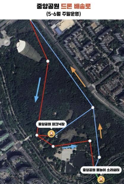 중앙공원 드론 배송은 5~6월, 9~11월의 토요일과 일요일에 운영되며, 이용 시간은 오전 11시부터 오후 5시까지(일몰 전)다. 단, 기상 상황이나 공군 관제권 내 비행 제한 등에 따라 운영 일정이 변경될 수 있다.