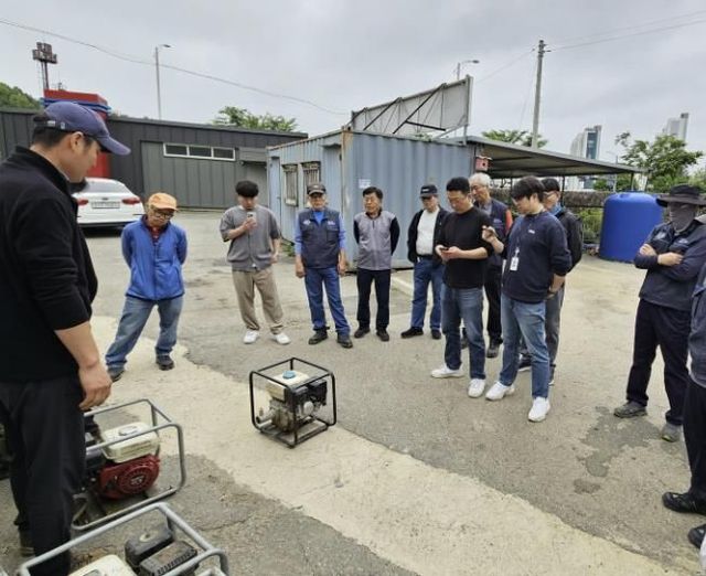 참여자들은 양수기와 호스 연결 방법, 연료 확인법, 시동 거는 법, 장비 점검 및 유지 관리 등 장비 운용 전반에 대해 실습으로 숙지했다. 수방 장비 사용 시 발생할 수 있는 안전사고 예방을 위한 주의 사항도 함께 안내됐다.