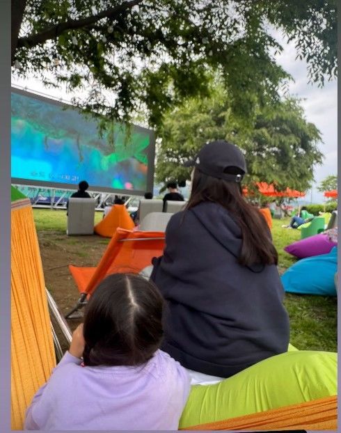 사진 속 최지우는 딸과 함께 한강공원 야외 영화 상영장을 찾은 모습이다.
