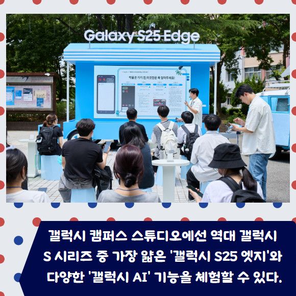 갤럭시 캠퍼스 스튜디오에선 역대 갤럭시 S 시리즈 중 가장 얇은 '갤럭시 S25 엣지'와 다양한 '갤럭시 AI' 기능을 체험할 수 있다. 또 △영상 △사진 △미술 △취업 준비 등 대학생들의 관심사와 라이프스타일에 맞춘 4가지 주제로 갤럭시 AI 활용법을 소개한다.