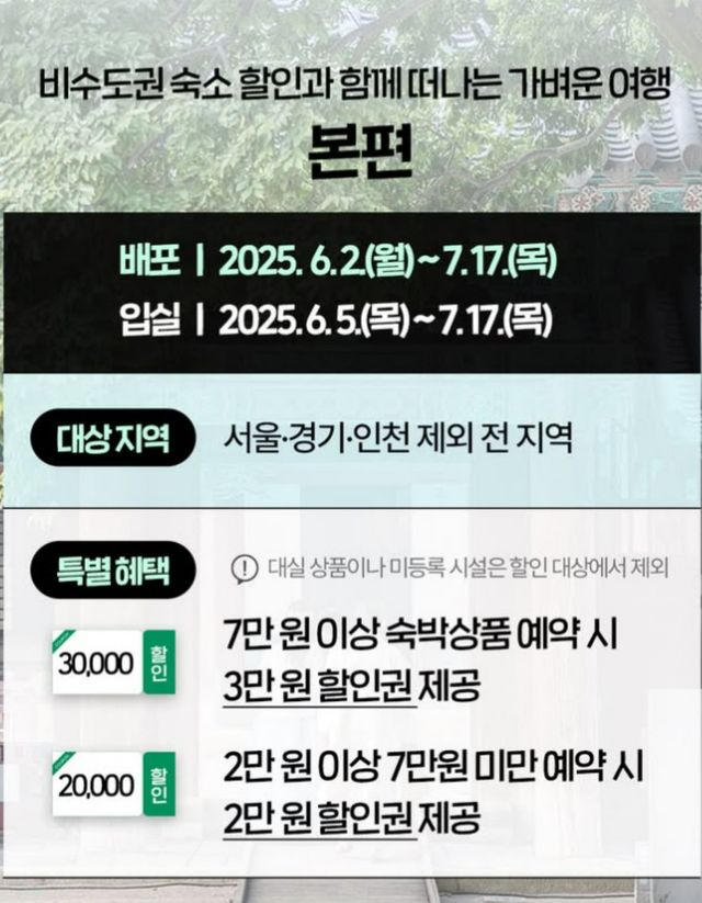 ‘본편’은 다음 달 2일부터 오는 7월 17일까지 수도권(서울·경기·인천)을 제외한 비수도권 지역의 숙박시설을 대상으로 25만 8500장 배포된다. 7만 원 이상 숙박 상품을 예약하면 3만 원, 2만 원 이상 7만 원 미만의 숙박 상품을 예약하면 2만 원 할인권을 지원받을 수 있다. 숙박 기간은 다음 달 5일부터 오는 7월 17일까지다.