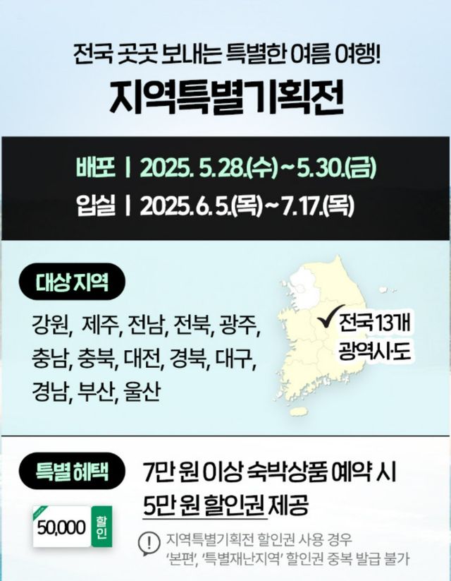 ‘지역 특별기획편'은 오는 28~30일까지 4만 1500장이 발급된다. 강원, 경남, 경북, 광주, 대구, 대전, 부산, 울산, 전남, 전북, 제주, 충남, 충북 등 13개 시도의 7만 원 이상 숙박 상품 예약 시 5만 원의 할인 혜택을 받을 수 있다. 숙박 기간은 다음 달 5일부터 오는 7월 17일까지다.