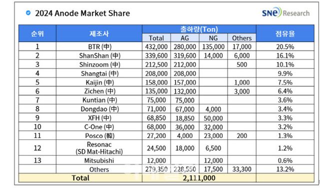 출하량 상위 10개 업체 모두 중국 업체였다. 출하량 기준 1위는 BTR로, 총 43만 2000t이상 출하했다. 이어 ShanShan이 34만t으로 2위, Shinzoom이 21만3000t으로 3위, Shangtai가 20만 8000t, Kaijin이 15만 8000t, Zichen이 13만 5000t으로 뒤를 이었다.