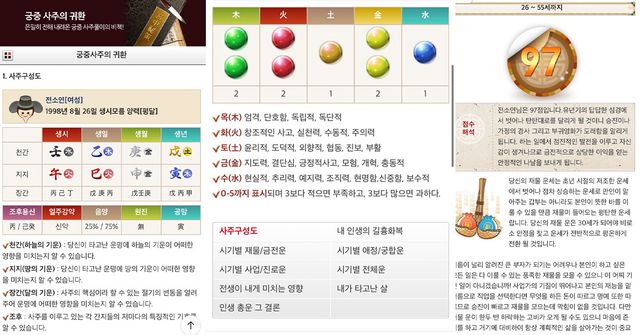 온라인 사주 전문 사이트 '위키사주'는 오랜 전통을 바탕으로 한 사주팔자와 현대적인 분석 기술을 결합하여 각자의 운명을 상세히 분석한다. 이름과 생년월일, 태어난 시간과 성별을 입력하면 간단하게 이용할 수 있다. 특히, 앞으로 3년 동안의 애정을 꿰뚫어볼 수 있는 애정운, 냉정하고 속시원한 궁합, 사랑에 관한 모든 것을 담은 타로까지 다양한 운세를 재미있게 점칠 수 있다.