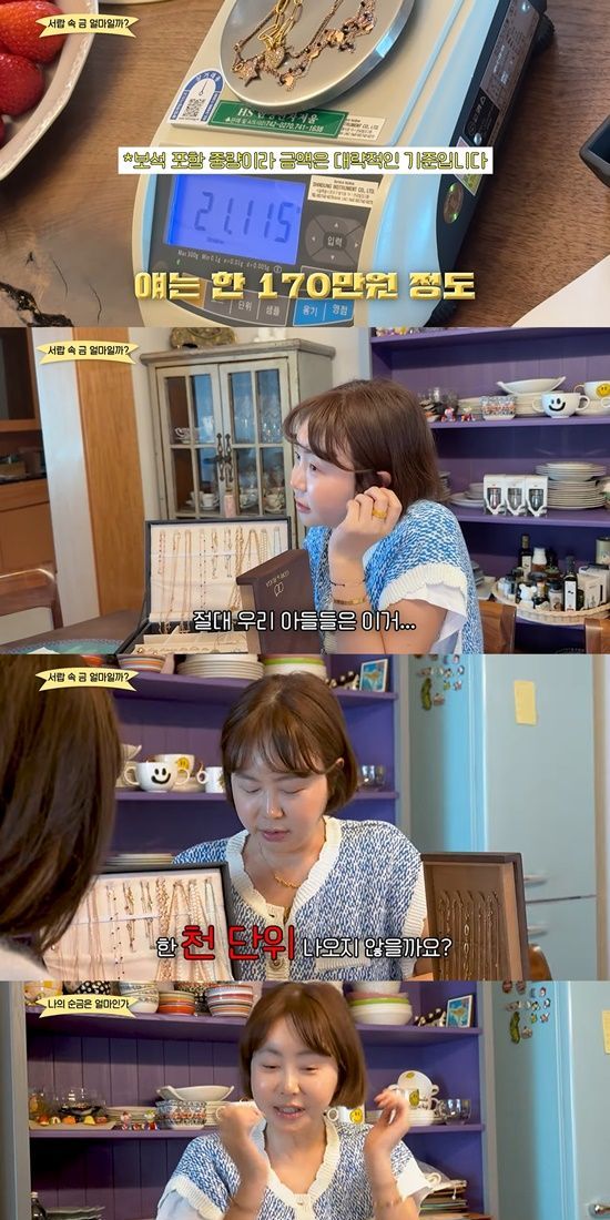 이어 금 목걸이 하나의 무게를 측정한 결과, 보석 포함 중량이 약 21.11g으로 시세 기준 약 170만 원으로 책정됐다. 예상보다 높은 금액에 황혜영은 "이걸 돈으로 바면 170만 원이냐"고 되물었고, "절대 우리 아들들은 이걸 (몰라야 된다)"고 덧붙였다.