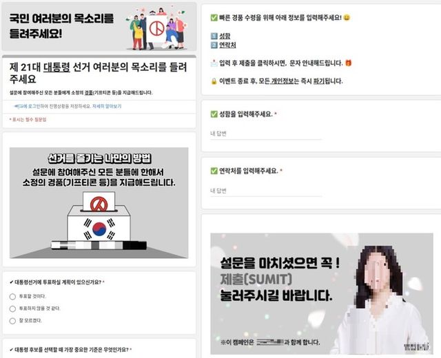 해당 URL을 누르면 '제21대 대통령 선거 여러분의 목소리를 들려주세요'라는 제목의 셀문조사 페이지로 연결된다. 또 '투표 계획', '후보 선택 기준' 등 질문을 제시해 실제 설문처럼 보이도록 연출했다.