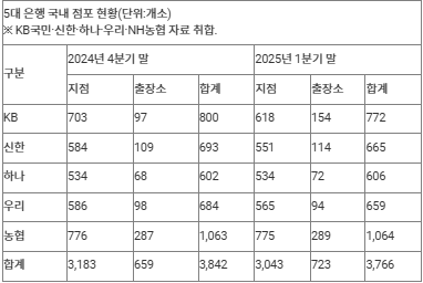 금융권에 따르면 5대 은행(KB국민·신한·하나·우리·NH농협)의 국내 점포 수는 올해 1분기 말 3천766곳으로 전 분기 말보다 76곳 줄었다.