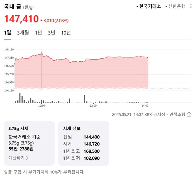 이러한 흐름에 따라 20일 뉴욕상품거래소 선물(6월물) 종가 기준 국제 금값은 트로이온스당 전일 대비 1.58% 오른 3284달러를 기록했다. 21일 오전 12시 4분 기준으로는 3303달러까지 상승했다.