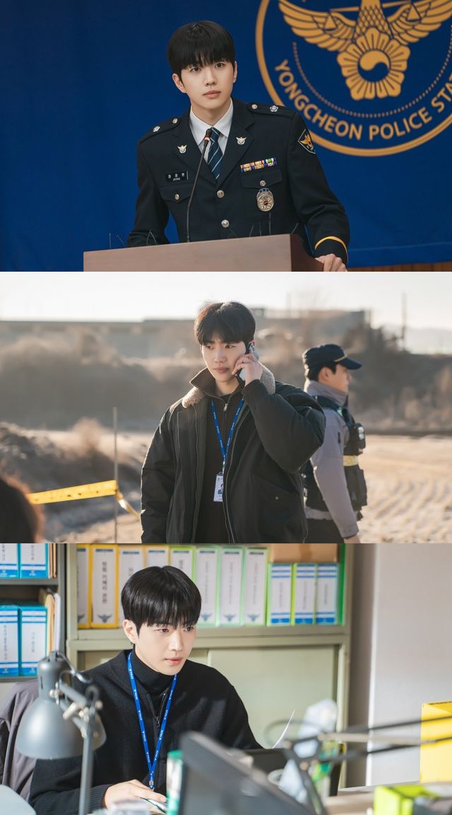 이 가운데 공개된 강훈의 캐릭터 스틸은 용천서 신임 강력팀장 정정현의 다층적인 매력을 완벽하게 포착해 눈길을 사로잡는다. 먼저 첫 번째 스틸에는 경찰 제복을 단정하게 갖춰 입고 단상 앞에 서 있는 정정현의 모습이 담겨있다. 반듯한 자세와 흔들림 없는 눈빛에서 책임감과 사명감이 고스란히 느껴지는 동시에 신임 팀장으로서의 패기와 사건 해결에 대한 강한 의지도 함께 엿보여 휴머니스트적인 면모 이면에 숨겨진 강단과 리더십을 느끼게 한다.