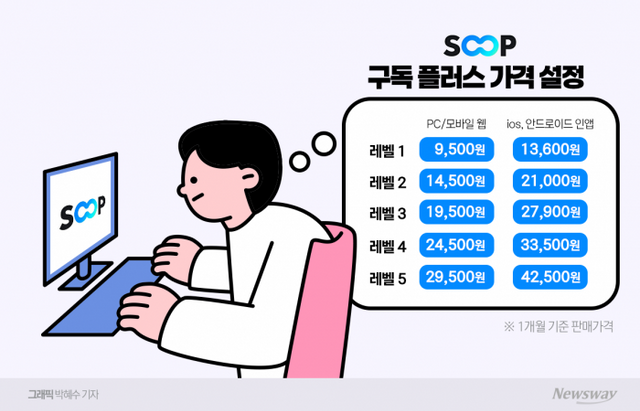 21일 업계에 따르면, SOOP은 오는 27일 이런 내용의 요금제를 포함해 구독 서비스(후원) 전반을 개편한다. 지난해 10월 티어 1, 2로 나눠 정기구독권 가격을 인상하는 변화를 준 지 약 6개월 만이다.