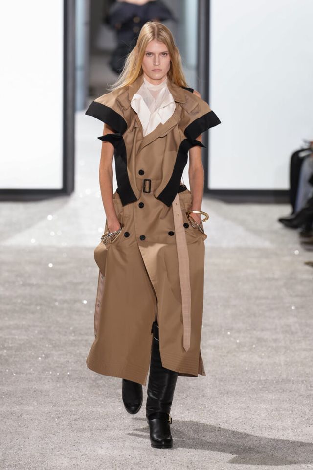 FAVORITE LOOK 숄더 라인 패턴을 조각내어 오프숄더로 디자인한 트렌치코트. 시폰 소재를 덧대 사카이의 믹스 매치와 해체주의 정신을 느낄 수 있다.