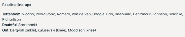 UEFA가 예상한 토트넘의 선발 라인업은 4-3-3 전형이었다. 굴리엘모 비카리오가 골문을 지키고, 페드로 포로, 크리스티안 로메로, 미키 판더펜, 데스티니 우도기가 백4를 구성한다.