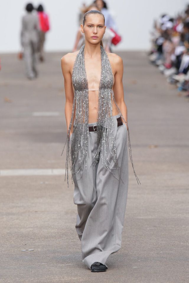 NOTE “당신이 사랑하는 것을 지키세요(Save What You Love).” 나지막하게 들리는 배우 헬렌 미렌의 내레이션으로 쇼가 시작됐다. 이번 시즌 지속 가능성을 추구하는 스텔라 매카트니의 시선은 새의 깃털 보호로 향했다. 작가이자 조류 관찰자인 조너선 프랜즌(Jonathan Franzen)의 책 에서 영감을 받아 새를 보호하자는 의미를 담아 컬렉션을 구성했다. 메시 보디수트 가슴 부분에 종이접기로 장식한 실크 비둘기 모티프와 전자와 의료 폐기물을 재활용해 만든 비둘기 조각 등 새 모티프를 곳곳에 표현해 컬렉션의 주제를 강조했다.