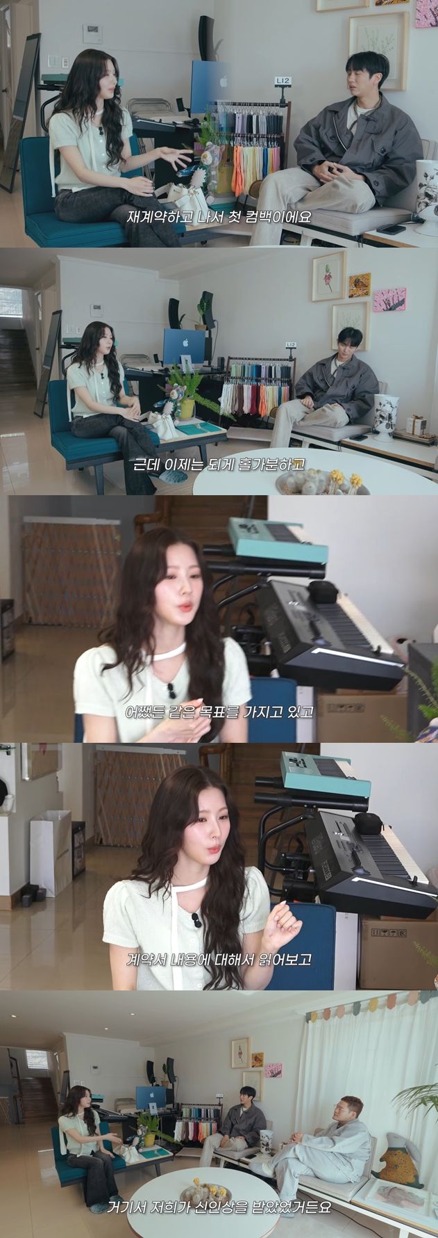 재계약 후 앨범 작업에 기분이 다르냐는 질문에 미연은 "지금은 홀가분하고 더 편하게 하게 된 것 같은데 그즈음에 되게 생각이 많았다. 같은 목표를 가지고 있고 하겠다는 생각은 물론 있었지만 끝날 때까지 끝난 게 아니다. 저희가 울먹였던 순간도 그럴 만했던 게 (올라가기) 전에 도장을 찍고 올라갔다"고 설명했다.