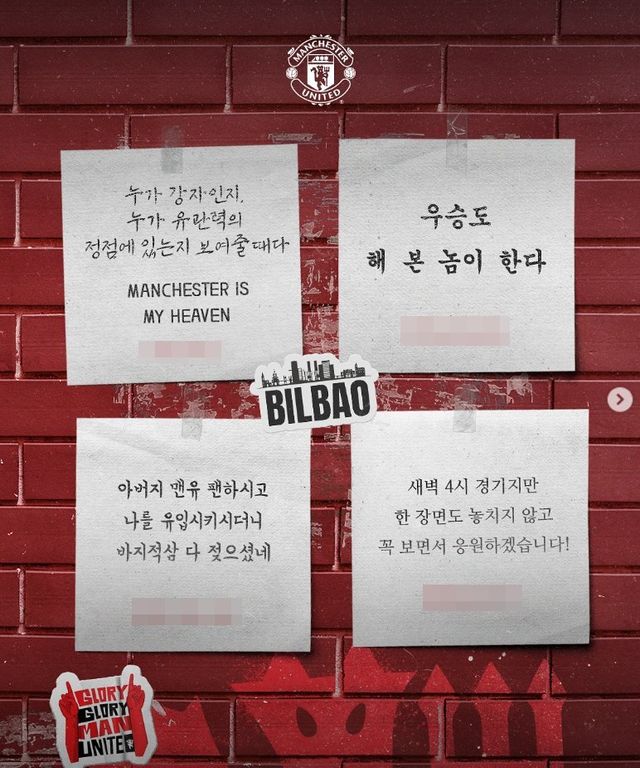 맨유는 21일(한국시간) 구단 공식 사회관계망서비스(SNS)를 통해 한국어로 "맨체스터 유나이티드의 우승을 염원하는 대한민국 팬 여러분들의 응원 메시지! 우리의 붉은 열정이 빌바오에서의 승리로 이어지길 기원합니다!"라고 작성했다.