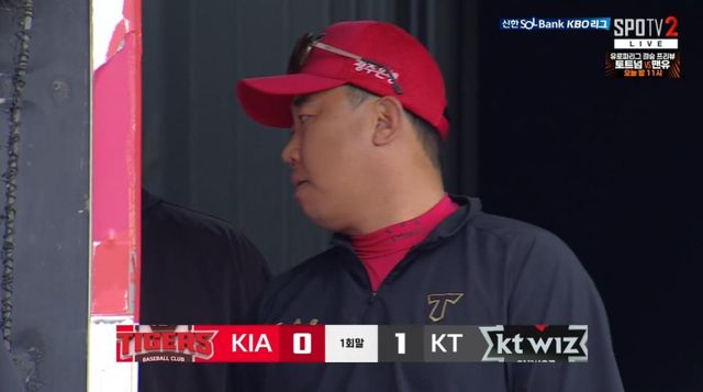 KIA로선 1회 말 수비가 뼈아팠다. 피안타 2개로 1사 1·3루 위기에 몰린 선발 아담 올러가 4번 장성우를 우익수 플라이로 유도할 때만 하더라도 손쉽게 아웃카운트를 챙기는 듯했다. 타구의 비거리가 짧아 3루 주자 황재균의 홈 쇄도가 쉽지 않았다. 그런데 예상하지 못한 상황이 전개됐다. 바로 우익수 최원준이 포구 실책을 저지른 것. 타구가 글러브에 맞고 튕겨 나가면서 주자들이 한 베이스씩 진루, 실점할 수밖에 없었다. 실책 직후 이범호 KIA 감독은 고개를 돌렸다.
