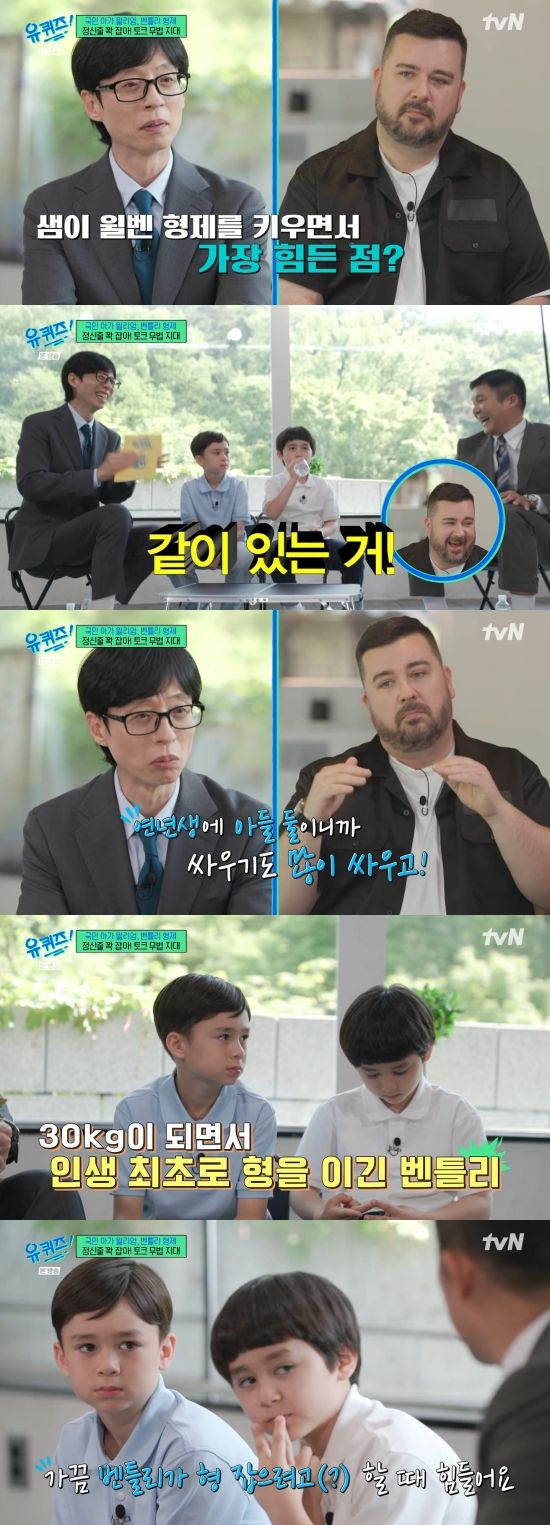 샘 해밍턴은 "둘이 연년생이다 보니까 둘 다 아들이다 보니까 솔직히 많이 싸운다. 서열은 벤틀리가 아까 30kg 나가는 게 자랑스러운 거다. 이때까지 형한테 이긴 적 한 번도 없었다. 몸무게로 이겼고 약간 형 잡으려고 할 때 있다. 그게 조금 힘들다. 이해가 힘든 거다. 외국 환경에는 형, 동생도 없고 서열 정리가 안 된다. 한국 환경에는 서열이 다 있고 양쪽에서 둘 다 이해해야 되는 게 늘 애들한테 미안하다. 애들은 혼란스러울 거다"라며 고백했다.