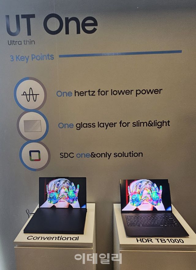 삼성디스플레이는 ‘UT One’ 기술을 컴퓨텍스에서 처음으로 공개했다. 이 기술은 초박형(Ultra Thin) 구조에 IT OLED 패널 최초로 1Hz 가변주사율(One Hz)이 가능한 차세대 저전력 기술로 기존 패널과 비교하면 소비전력을 30% 더 줄일 수 있다.
