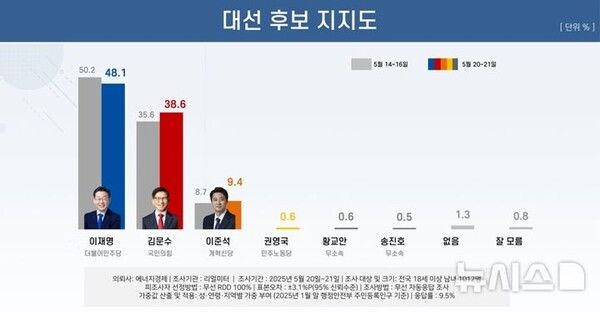 차기 대선 후보 지지도 조사에서 이재명 더불어민주당 후보가 48.1%, 김문수 국민의힘 후보가 38.6%를 기록했다는 여론조사 결과가 22일 나왔다.