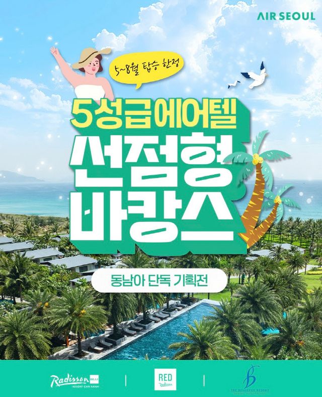이번 프로모션은 에어서울이 운항하는 동남아 전 노선(나트랑, 다낭, 보홀)에 적용된다. 5성급 호텔을 매우 합리적인 가격에 이용할 수 있으며 레이트 체크아웃 혜택도 포함되어 만족도가 높을 것으로 기대된다.