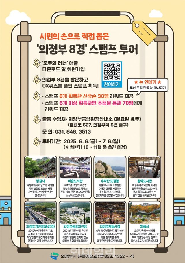 김동근 시장은 “의정부 8경 선정은 기존 행정 주도의 형식에서 벗어나 시민과 함께 만들어가는 관광정책의 첫걸음”이라며 “이번 스탬프 투어는 단순한 관광을 넘어 시민과 관광객이 직접 지역 명소를 체험하고 기억에 남길 수 있는 소중한 기회가 될 것”이라고 말했다.
