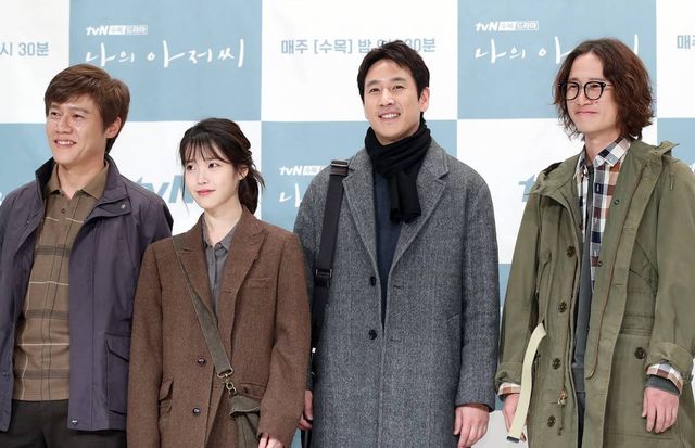배우 박호산(왼쪽부터), 이지은(아이유), 이선균, 송새벽이 2018년 4월 11일 오후 서울 영등포 타임스퀘어에서 열린 tvN 드라마 ‘나의 아저씨’(나저씨) 기자간담회에 참석해 포즈를 취하고 있다. ‘나의 아저씨’는 삶의 무게를 버티며 살아가는 사람들이 서로를 통해 삶의 의미를 찾고 치유해가는 이야기를 그린 작품이다 / 뉴스1