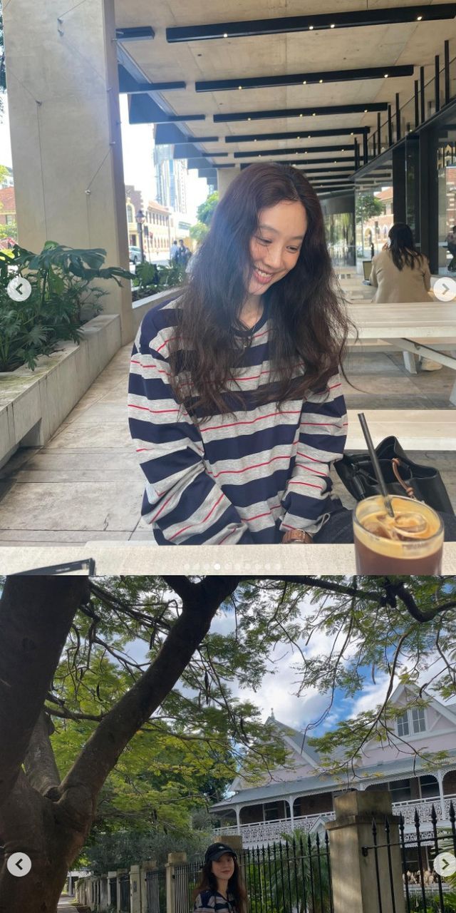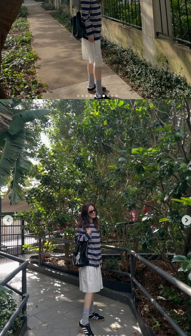 사진 속 정려원은 편안한 스트라이프 티셔츠에 흰색 스커트를 매치한 내추럴한 룩으로 도심 속 산책을 즐기고 있다. 모자와 백팩으로 포인트를 더한 캐주얼한 스타일이 눈길을 끈다.