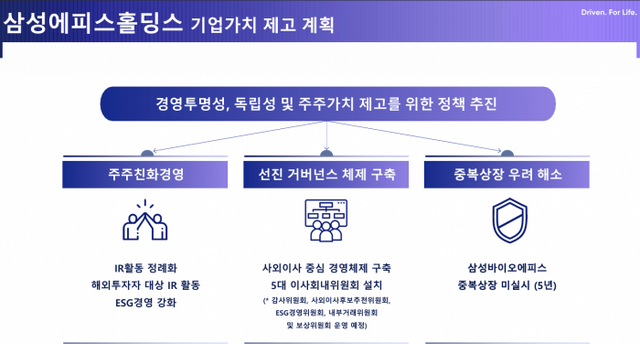 특히 삼성에피스홀딩스는 주주친화경영과 선진 거버넌스 체제를 구축한다고 강조했다. 이를 위해 IR활동을 정례화하고 사외이사 중심 경영체제 구축, 5대 이사회내위원회를 설치한다. 또한 중복상장 우려 해소를 위해 삼성바이오에피스 중복상장을 5년 동안 실시하지 않는다.