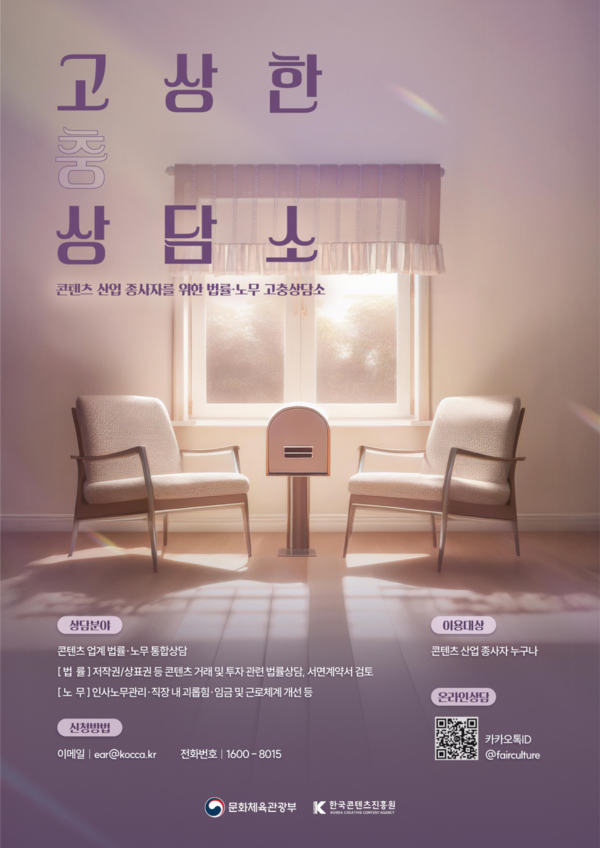 한국콘텐츠진흥원(이하 한콘진)은 콘텐츠 산업 종사자의 권익 보호와 공정한 생태계 조성을 위해 노무·법률 통합 상담 프로그램인 고상한 상담소를 연중 상시 운영하고 있다.