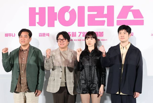 강이관 감독(왼쪽부터)과 배우 김윤석, 배두나, 장기하가 지난달 28일 서울 용산구 CGV 용산아이파크몰에서 열린 영화 '바이러스' VIP 시사회에 참석해 포즈를 취하고 있다. '바이러스'는 이유 없이 사랑에 빠지는 치사율 100% 바이러스에 감염된 택선(배두나 분)이 모쏠 연구원 수필(손석구 분), 오랜 동창 연우(장기하 분), 그리고 치료제를 만들 수 있는 유일한 전문가 이균(김윤석)까지 세 남자와 함께하는 예기치 못한 여정을 그린 작품이다 / 뉴스1