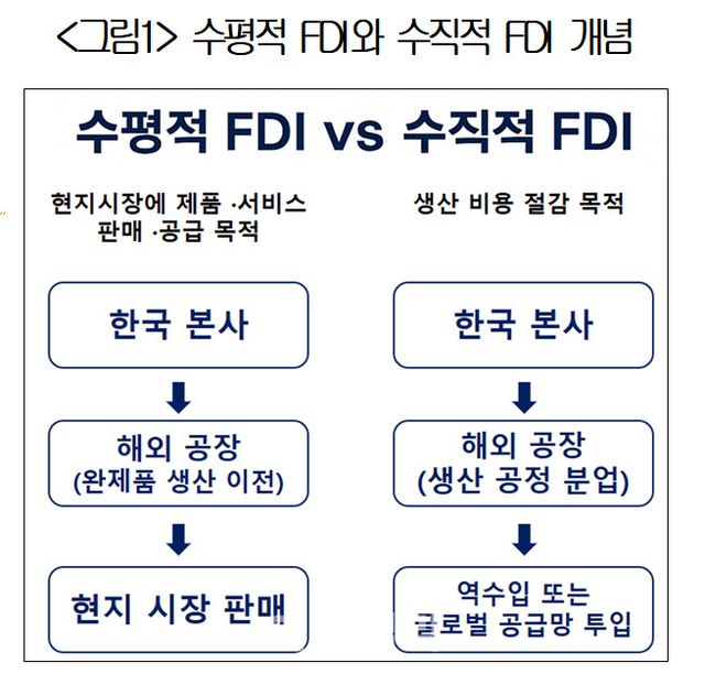 전체 해외직접투자 금액 중 수평적 해외직접투자의 비중은 2010년 52.5%에서 2024년 62.8%로 10%포인트 이상 상승했다. 전체 해외직접투자중 수평적 투자의 비중을 지역별로 보면 최근 5년간 미국으로의 투자 비중이 2020년 63%에서 2024년에는 87.3%로 크게 상승했다. 최근 삼성전자(005930)의 반도체 투자 확대, SK하이닉스(000660)의 인공지능(AI) 메모리 관련 투자, LG에너지솔루션(373220)의 배터리 공장 설립, 현대자동차 그룹의 미국 내 투자 확대 발표 등은 수평적 해외직접투자의 대표적인 사례다.