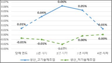 수평적 해외직접투자가 수출에 미치는 영향은 고기술 제조업과 중저기술 제조업 모두에서 전 시차에 걸쳐 통계적으로 유의한 긍정적 영향을 미치는 것으로 나타났다. 투자 후 1~3년에 걸쳐 평균 각각 0.16%, 0.11% 증가한 것으로 분석됐다. 수평적 해외직접투자가 국내고용에는 통계적으로 유의한 영향을 미치지 않는 것으로 분석됐다. SGI는 “생산에 대한 긍정적 영향에도 불구하고 고기술 제조업 여부와 지역에 상관없이 고용에는 대체적으로 유의한 영향을 미치지 못하는 것으로 나타났다”고 했다.