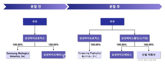 삼성바이오로직스는 이날 공시를 통해 삼성바이오로직스(207940)(CDMO, 존속회사)와 삼성에피스홀딩스(삼성바이오에피스 포함 자회사 관리, 신설회사)로 단순·인적분할을 한다고 밝혔다. 신설되는 삼성에피스홀딩스는 삼성바이오에피스를 100% 자회사로 편입한다.