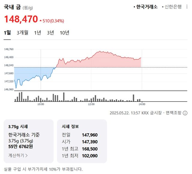 국내 금시세(금값)가 22일(한국 시각) 오후 상승세(전 거래일 대비)를 보이고 있다.