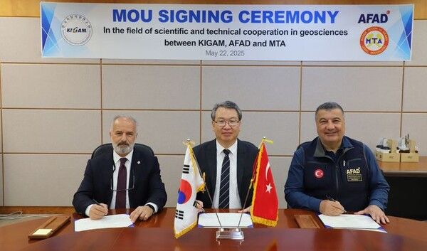 한국지질자원연구원(KIGAM)은 22일 연구원 백악기룸에서 튀르키예 재난위기관리청(AFAD), 튀르키예 광물탐사연구소(MTA)와 국제협력 강화를 위한 3자간 업무협약(MOU)을 체결하고 판내부 지진 및 단층, 화산연구 분야서 힘을 모으기로 했다고 밝혔다.