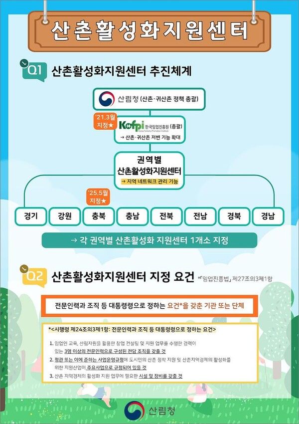 산림청은 지역 산촌활성화지원센터를 2030년까지 8개도에 각 1개소씩 지정하는 등 점차적으로 확대할 계획이다.