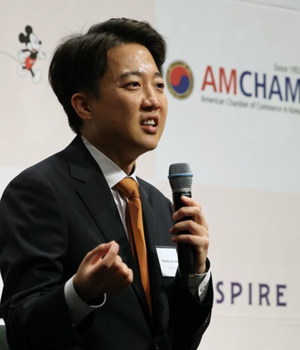 이준석 개혁신당 대선 후보가 22일 오후 서울 용산구 그랜드하얏트서울에서 제임스 김 주한미국상공회의소(AMCHAM·암참) 회장과 대담하고 있다. / 뉴스1