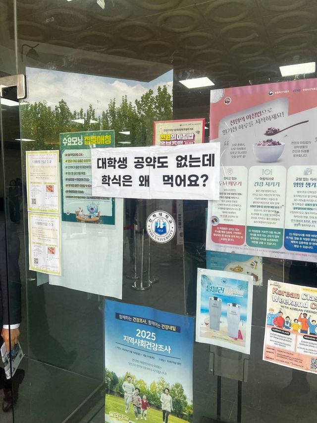 인하대 건물 유리문에도 이 후보를 향한 메시지가 붙었다. 여기엔 "대학생 공약도 없는데 학식은 왜 먹어요?"라는 말이 쓰여 있었다.