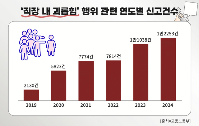 고용노동부 등에 따르면 '직장 내 괴롭힘 금지법'이 시행된 2019년 이후 신고 건수는 매년 꾸준히 늘고 있다. 지난해의 경우 시행 첫해 대비 신고 건수가 무려 6배 가량 폭증했다. '직장 내 괴롭힘' 행위 관련 연도별 신고건수는 ▲2019년 2130건 ▲2020년 5823건 ▲2021년 7774건 ▲2022년 7814건 ▲2023년 1만1038건 ▲2024년 1만2253건 등이었다. 현행 근로기준법 '제76조의 2'에서는 사용자 또는 근로자가 직장에서의 지위 또는 관계 등의 우위를 이용해 업무상 적정범위를 넘어 다른 근로자에게 신체적·정신적 고통을 주거나 근무환경을 악화시키는 행위를 해서는 안 된다고 규정하고 있다.
