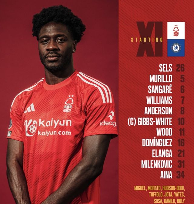 홈팀 노팅엄은 4-3-1-2 포메이션을 가동했다. 마츠 셀스가 골키퍼 장갑을 착용했다. 네코 윌리엄스, 무릴루, 니콜라 밀렌코비치, 올라 에이나가 수비진을 구성했다. 올라 에이나, 이브라힘 상가레, 니콜라스 도밍게스가 중원에 위치했다. 그 앞에 모건 깁스화이트, 전방 투 톱은 안토니 엘란가, 크리스 우드가 출전했다.