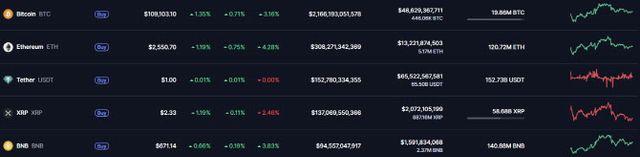 26일 글로벌 가상자산 시황중계 사이트 코인마켓캡에 따르면 이날 오전 8시 기준 비트코인 가격은 24시간 전 대비 0.71% 오른 10만 9103달러에 거래됐다. 일주일 전과 비교하면 3.16% 상승했다. 알트코인(비트코인 외 가상자산)의 대표격인 이더리움은 전일 대비 0.75% 오른 2550달러를 기록했다.