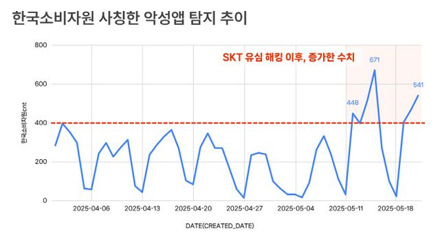 특히 ‘한국소비자원’ 사칭 앱은 5월 초 SKT 사고 직후 탐지 건수가 급증했으며, 해킹 피해 구제를 명분으로 사용자에게 접근해 설치를 유도한 것으로 분석된다.