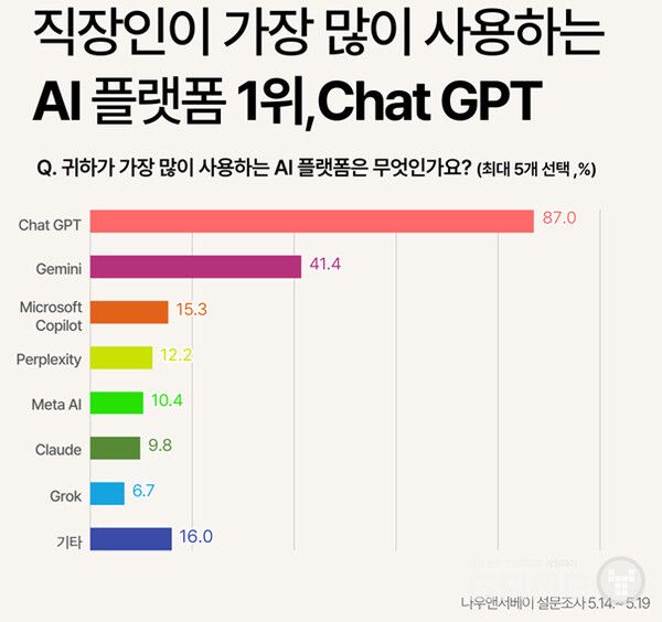 AI 플랫폼을 사용하는 직장인에게 ‘자주 사용하는 AI 플랫폼(복수 선택)’을 물은 결과, ChatGPT가 87%로 압도적 1위를 차지했으며, Google Gemini(41.4%), Microsoft Copilot(15.3%), Perplexity AI(12.2%), Meta AI(10.4%), Claude(9.8%), Grok(6.7%) 등이 뒤를 이었다. 이는 ChatGPT를 중심으로 하되, AI 생태계가 빠르게 다변화되고 있음을 보여준다.
