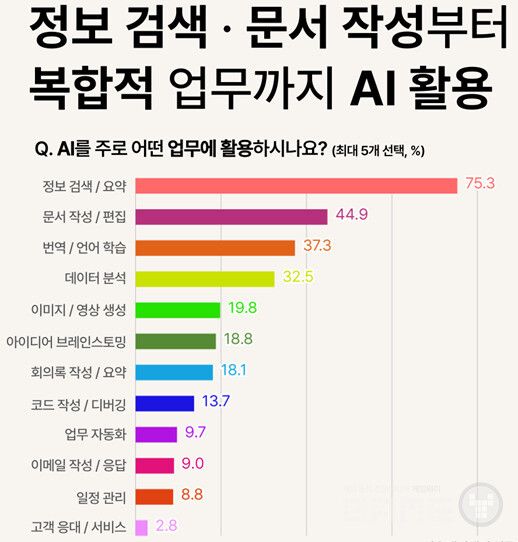 직장인들이 AI를 활용하는 목적은 ‘정보 검색/요약’(75.3%)이 가장 높은 비율을 차지했으며, ‘문서 작성/편집’(44.9%), ‘번역/언어 학습’(37.3%), ‘데이터 분석’(32.5%) 등이 주를 이루었다. 또한 ‘이미지·영상 생성’(19.8%), ‘아이디어 브레인스토밍’(18.8%) 등 창의적이고 복합적인 업무에도 AI 활용이 확산되는 추세다.