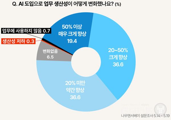 ‘AI 도입으로 업무 생산성이 어떻게 변화했나요?’라는 질문에 응답자의 92.6%가 ‘생산성이 향상되었다’고 답해, “변화 없음”(6.5%), “오히려 저하되었다”(0.3%)는 응답을 크게 웃돌았다.