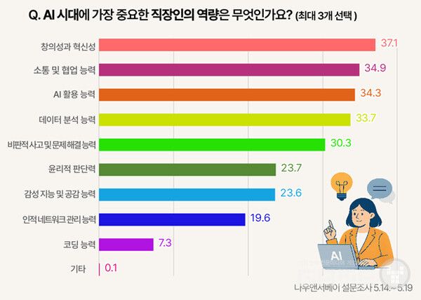 ‘AI 시대에 가장 중요하다고 생각하는 직장인의 역량은 무엇인가요?’라는 질문에 대하여 응답자들이 가장 많이 꼽은 것은 ‘창의성과 혁신성’(37.1%)이었고, ‘소통 및 협업 능력’(34.9%), ‘AI 활용 능력’(34.3%), ‘데이터 분석 능력’(33.7%) 등이 뒤를 이었다. 이는 AI 도구·데이터 활용 능력과 함께 창의성, 소통 및 협업 능력 등 인간 고유의 감성과 소통 능력의 중요성이 부각되고 있음을 시사한다.