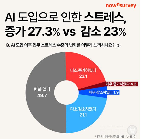 AI 도입으로 인한 스트레스가 다소 증가했다(23.1%)는 의견이 다소 감소했다(21.1%)는 의견보다 더 높은 것으로 나타났다. 이는 AI 도입 이후 업무 스트레스 수준의 변화를 어떻게 느끼나 하는 질문에 대한 답으로 변화 없다(49.7%는 의견이 가장 높았지만 다소 증가했다는 의견이 다소 감소했다는 의견보다 더 많았고, 매우 증가했다는 의견도 4.2%로 매우 감소했다(1.9)보다 더 많았다.