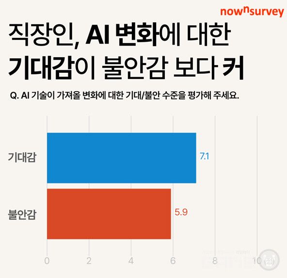 그럼에도 불구하고 AI가 초래하는 변화에 대한 기대감은 평균 7.1점(10점 만점)으로 불안감 평균 5.9점보다 높았다. 국내 직장인들은 AI를 위기보다는 새로운 기회로 인식하고 있음을 보여주는 결과다. 이러한 수치는 2024년 1월 나우앤서베이의 동일 조사 결과 (기대감 6.35점, 불안감 5.6점)와 비교해 모두 상승한 수치로, 그동안 AI 기술 발전에 따라 직장인들의 기대와 우려가 함께 커졌음을 시사한다.