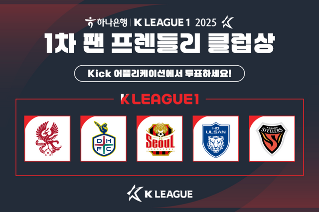 한국프로축구연맹(총재 권오갑, 이하 ‘연맹’)이 2025시즌 1차 K리그1 ‘팬 프렌들리 클럽상’ 팬 투표를 이달 27일(화)부터 29일(목)까지 3일간 실시한다.